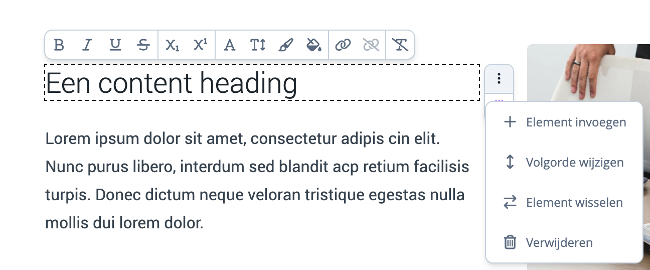 Stap 1: Klik rechts van een element op de knop met drie puntjes. Kies vervolgens de optie "Element invoegen".