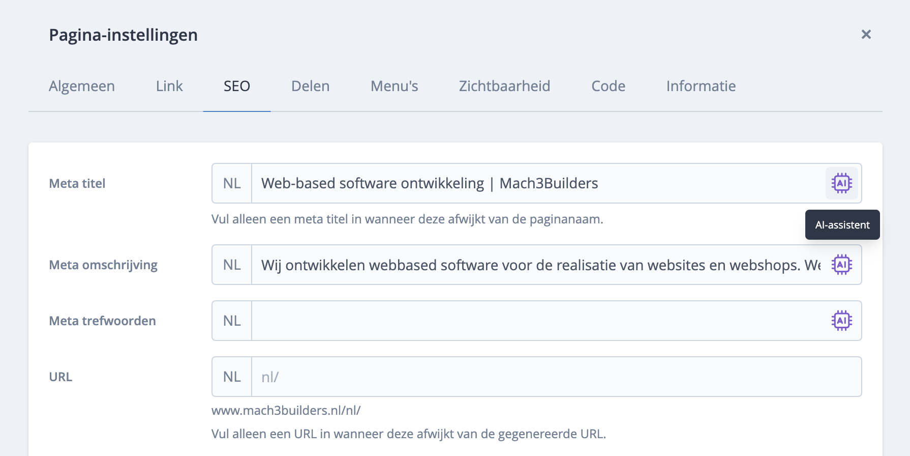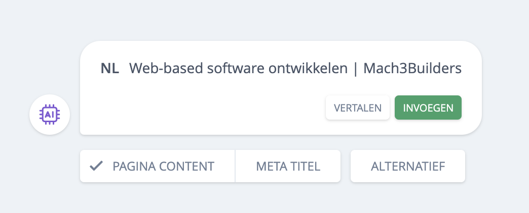 Met de AI-assistent kun je op basis van de pagina-content de meta-titel generen. Mach3Blocks haalt alle tekstuele content van de pagina en stuurt deze door de AI-engine. De AI-engine retourneert vervolgens de meta-titel.