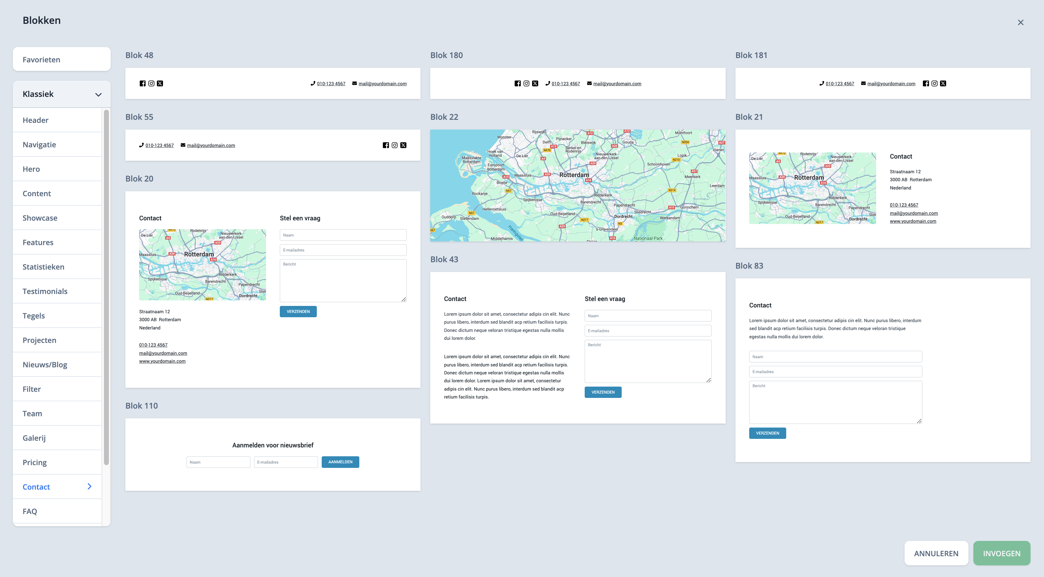 In Mach3Blocks zitten verschillende blokken waarin een formulier opgenomen is. Je vindt deze blokken in de categorie "contact".