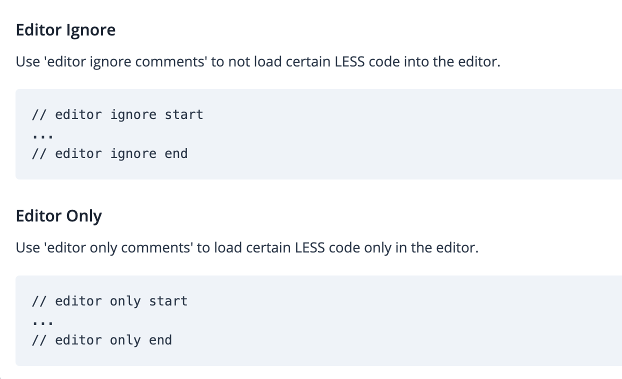 Code die je gebruikt wil je soms uit kunnen zetten in de editor. Met onderstaande statements kun je bepaalde delen van de code (LESS en JS) uitzetten.