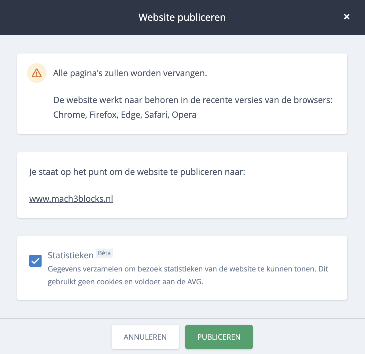 Voor iedere website kun je in Mach3Blocks statistieken aanzetten. Vanaf het moment van aanzetten worden dan de bezoekgegevens bijgehouden. Dit betreft enkel gegevens die niet aan personen te herleiden zijn en volledig AVG proof. We maken hierbij gebruik van Plausible. Voor meer informatie over de manier waarop Plausible statistieken bijhoudt verwijzen we je naar de website van Plausible. https://plausible.io/